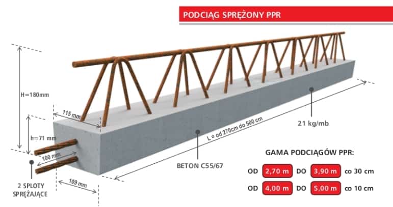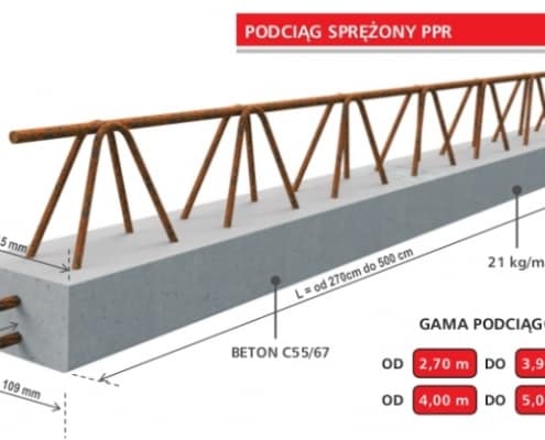 Podciągi sprężone to prefabrykowane elementy konstrukcyjne z betonu wysokiej wytrzymałości, służące jako główne belki nośne w halach przemysłowych i budynkach wielkopowierzchniowych. Produkowane są metodą strunobetonową z zastosowaniem cięgien sprężających, zapewniającą wyjątkową nośność przy dużych rozpiętościach. Stosowane są w budownictwie przemysłowym, magazynowym oraz obiektach użyteczności publicznej.